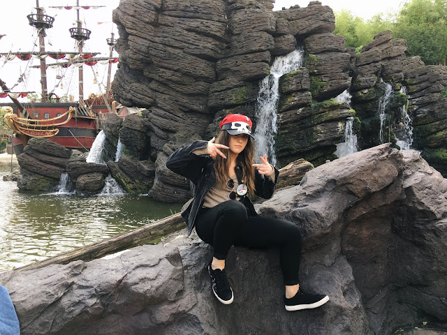 If you're a big Pirates of the Caribbean fan like Amy, we stumbled across the perfect place for photos. I honestly couldn't believe how lucky we got, its super close to the Pirates ride in fact if you face the sign and turn around its just behind a small white wall. This spot is awesome and looks amazing in pictures with the skull island skull and the Pirate ship it makes for an excellent image.